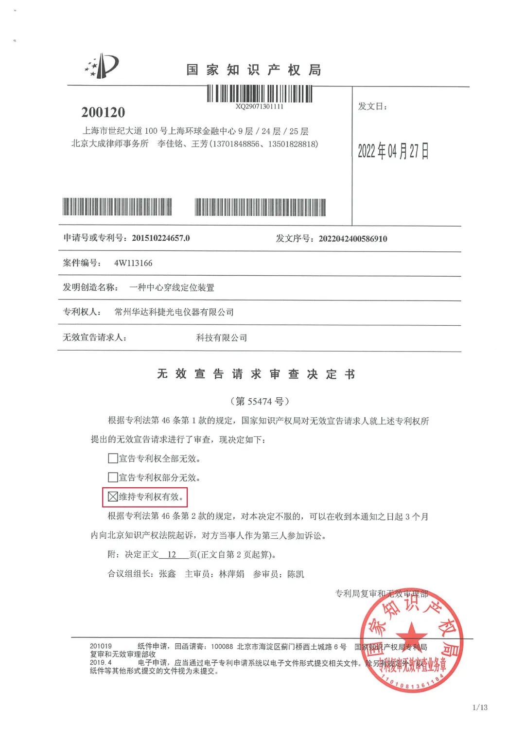 The technical feature of the invention patent of "a center threading positioning device" is that the center limit part and the cross shaft are fixed. Compared with the prior art and the published patents of China, the United States, Japan and other countries, this patent has outstanding substantive characteristics and significant progress, so it is creative. At the same time, this patent is widely used in the key products manufactured by our company, which can not only streamline the technological process and reduce the production cost, but also make significant contributions to the lightweight, quality and environmental protection of the products.